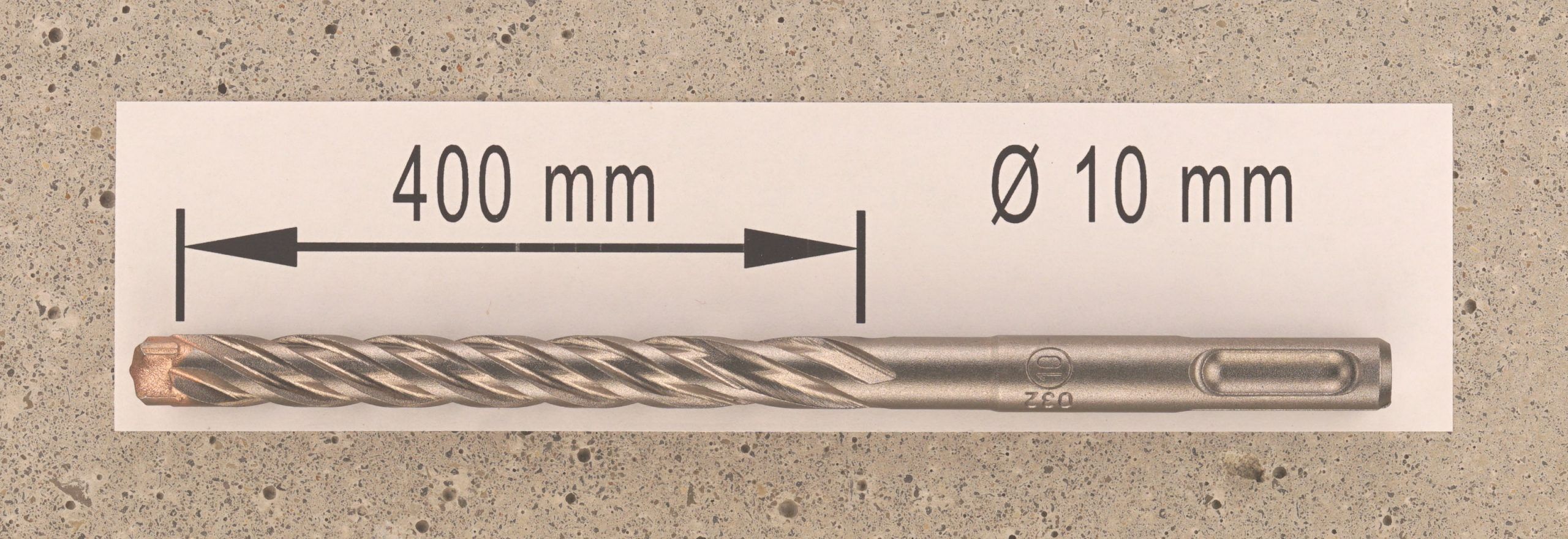 Durchmesser 10 mm, Spirallänge 400 mm, Gesamtlänge 450 mm, mit 4 Vollhartmetall-Schneiden und progressiven Spiralendesign. SDS-Plus (10 mm Bohrerschaft).