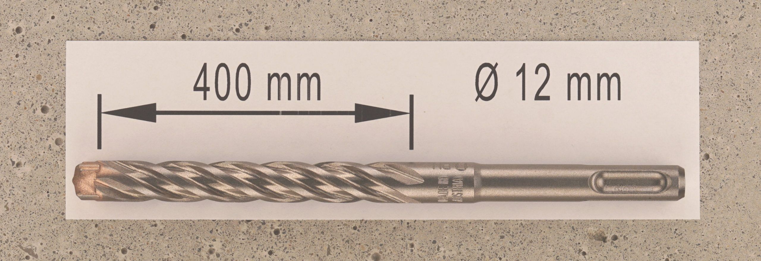 Durchmesser 12 mm, Spirallänge 400 mm, Gesamtlänge 450 mm, mit 4 Vollhartmetall-Schneiden und progressiven Spiralendesign. SDS-Plus (10 mm Bohrerschaft).